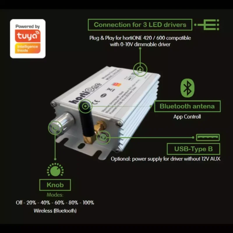 - Kompatibel mit hortiONE V3 und anderen 0-10V LED-Treibern