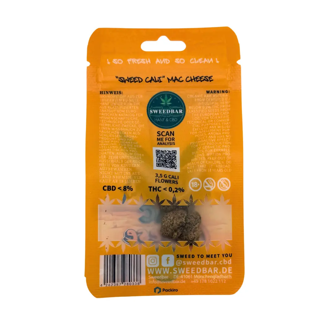 Sweedbar M.A.C. Cheese Cali CBD Blüten sind ein echter Gourmet-Tipp unter den CBD Blüten – direkt aus Kalifornien und voller Charakter. Diese aromatisch vielschichtige Sorte vereint cremig-käsige Noten mit floralen Akzenten und liefert dabei einen CBD-Gehalt von 9,57 % bei nur 0,11 % THC. Die aromatische Basis bildet die bewährte Dioica 88, eine robuste, EU-zugelassene Nutzhanf-Sorte mit hoher Stabilität. Perfekt für entspannte Abende, kreative Pausen oder genussvolle Rituale – ganz ohne psychoaktive Wirkung. 🌿💨